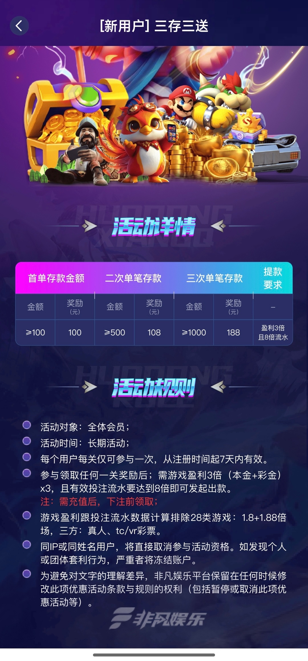 ✅一周最少充值3天,每周一领取,充提金额相差不大没有周常驻,如充值500提现 550 无周常驻(彩金一水,不限制任何游戏)