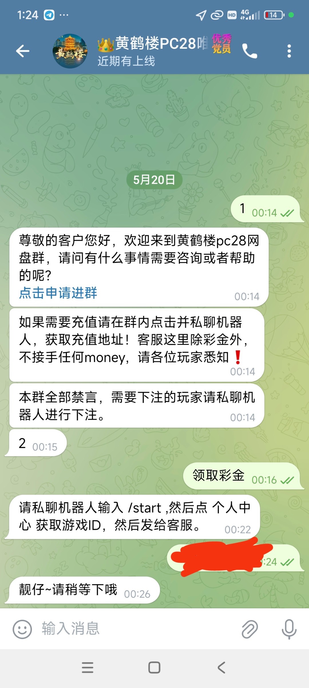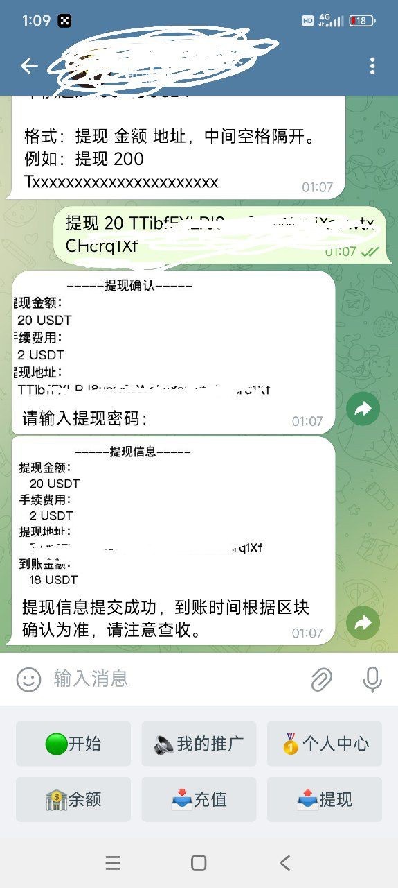 添加飞机客服 HHL999999 进群私聊机器人输入 /start ,然后点 个人中心 获取游戏ID,然后发给客服。刚开始以为不能提,打到80u流水不够刷流水后续没中剩20u提了扣2u到账18u
