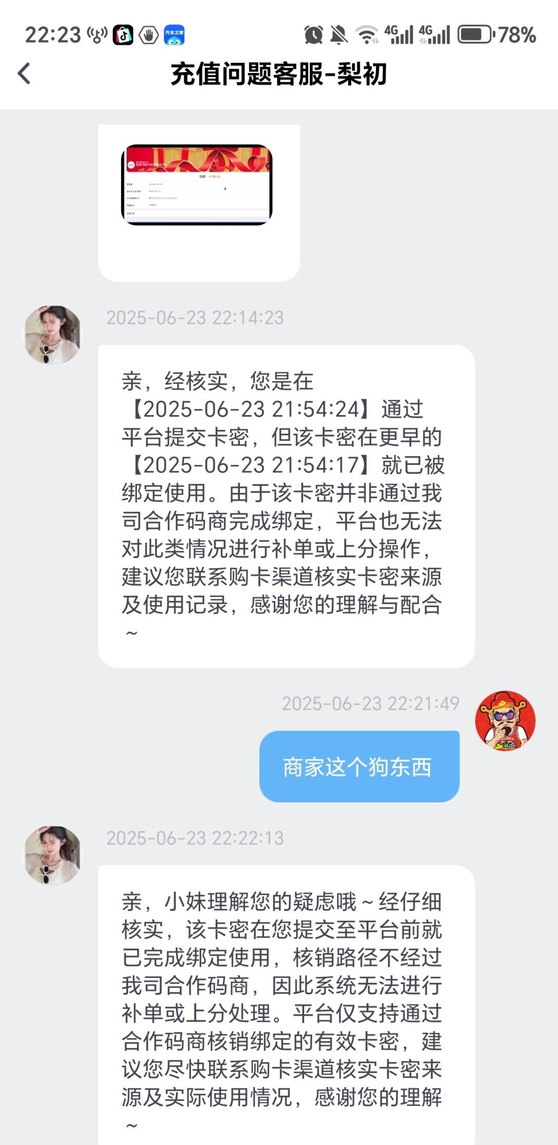 不是平台的问题,我21点55分提交的,卡密是21点54分17秒被使用的。