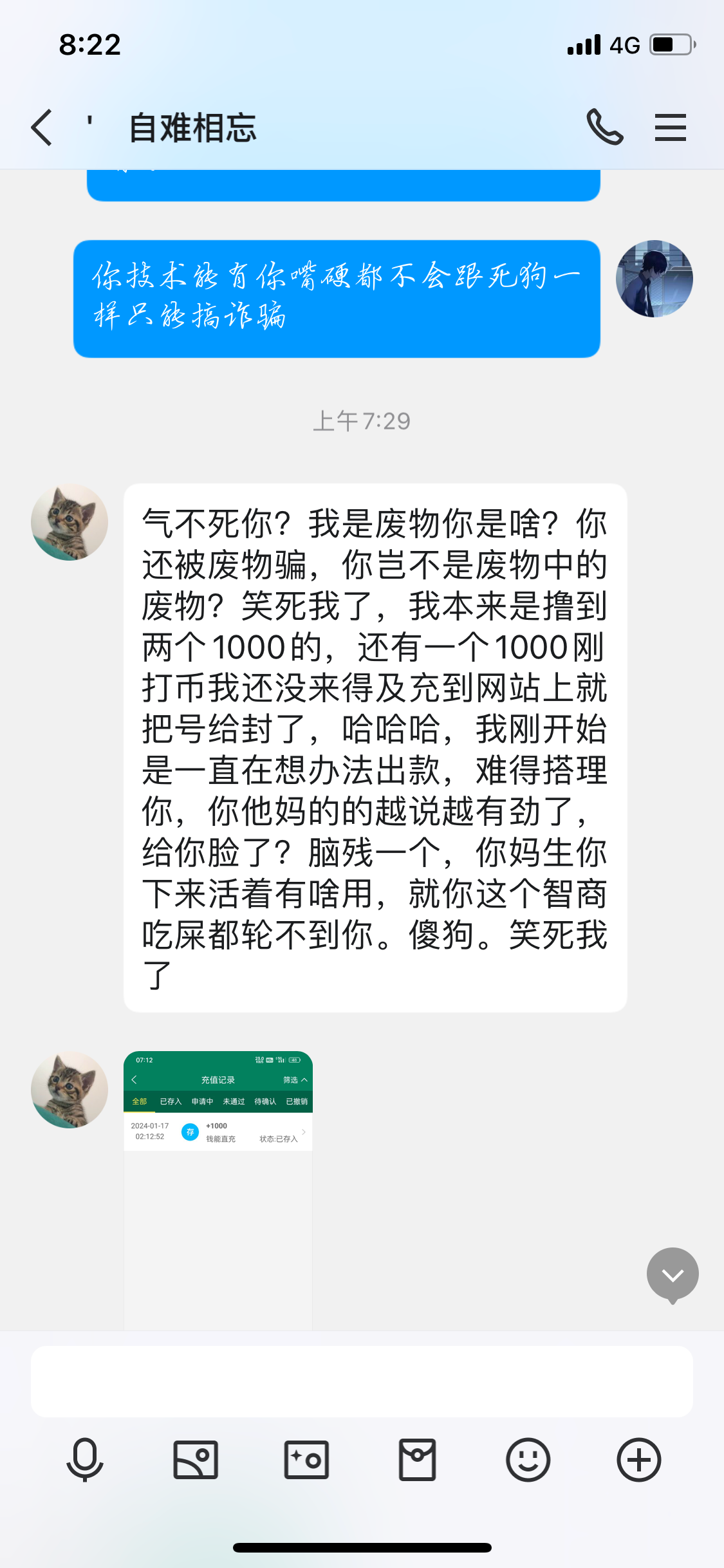 这个傻逼说收钱能钱包用于跑分什么的其实就是拿去骗币,开始500收后面登上去了说没登上去不承认然后等着半夜睡着了偷偷拿去骗币,死吗骗号狗,开始在骗币问他还不承认被这畜牲撸了1000