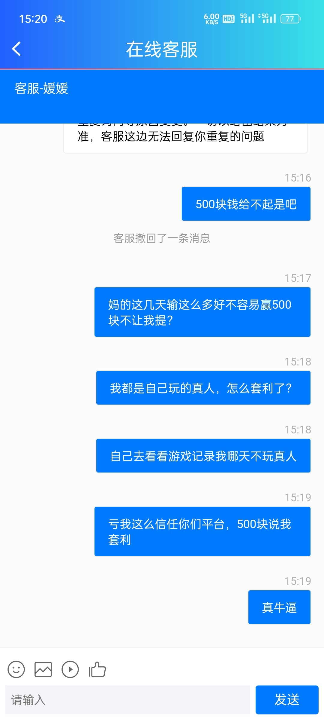 我也是,充了 50 赢到 600.也不给我提现,也是说我套利