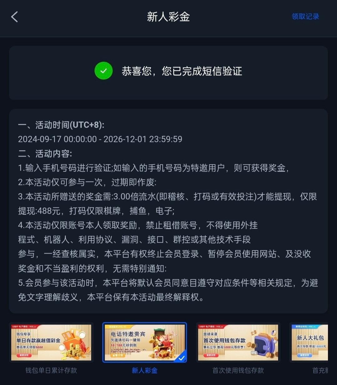 新用户注册,必须要用常用绑定手机号码绑定,填写取款密码后,在优惠中找到,填写号码,即可领取8-188,具体自测切记勿充值。