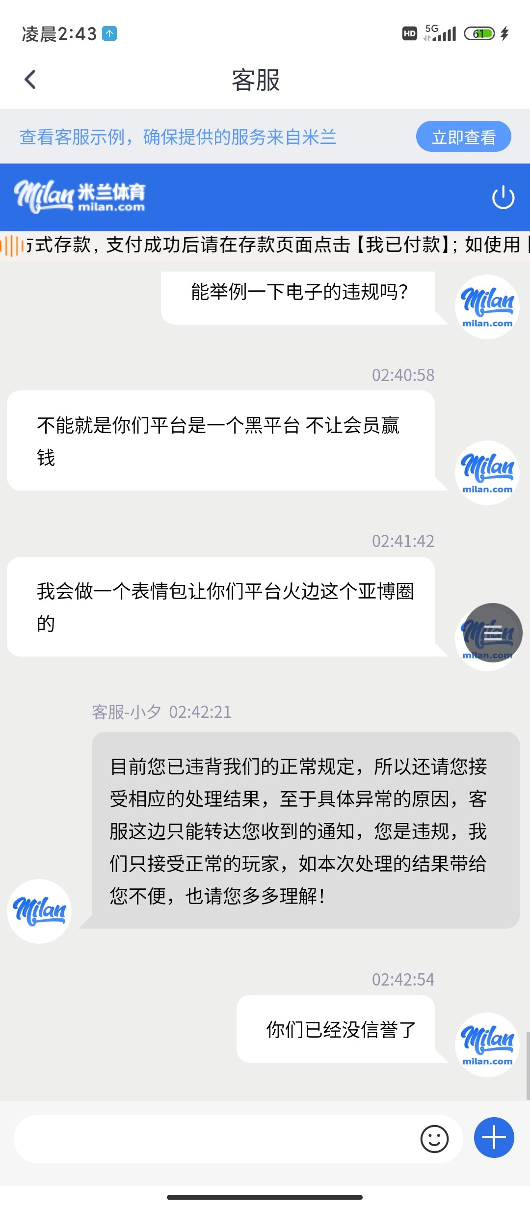 米兰体育 黑台 送的回归彩金不能让你赢 赢就封号,送了58 只玩了pg电子里面的寻宝黄金城4毛钱的注,买了很多次免费,赢到了218提现,一直审核,过了一个多小时账号被退了,重新登陆账号暂不能用,直接封号,能送你彩金但是你不能提,提现就封你号,米兰真牛逼哈哈哈,玩电子能玩出违规来,让客服举个例子也举不出来,就是封你号你能咋滴